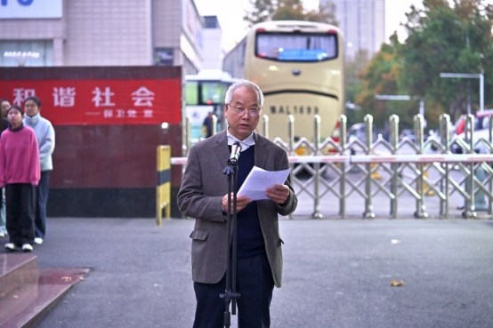 岳学超作国旗下讲话,他强调,青年是时代的潮头勇者,肩负着国家振兴的重任,要用行动回馈党和国家,为实现中华民族伟大复兴奋斗。他向全体同学提出三点希望:一是审视自我,找到毕生热爱的事,把人生的路走正;二是打开自我,遇见志同道合的人,把人生的路走宽;三是突破自我,锚定值得奔赴的目标,把人生的路走长。