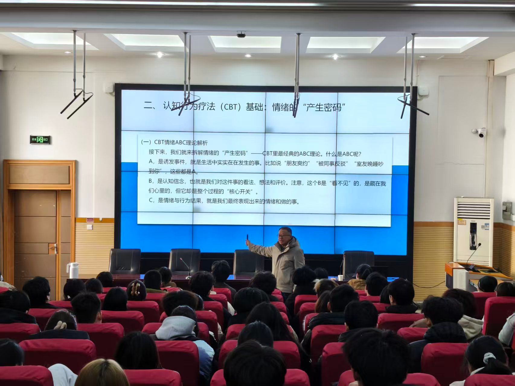 讲座中,杨伯箫教授以生动鲜活的案例为切入点,深刻剖析了情绪与人际关系的内在关联,指出情绪管理能力直接影响人际关系。针对高职学生的群体特点,专家系统讲解了认知行为疗法(CBT)的“情绪挑战四步法”和“情绪ABC理论”,通过现场互动问答、情景模拟等形式,引导学生学会精准感知自身情绪状态,掌握科学的情绪调节策略。