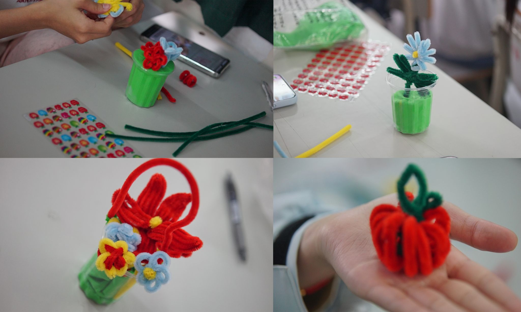 在“绒线心花照青春”手工活动上,学生用扭扭棒创作“星光花束”,在动手实践中放松身心、释放压力,感受内心平静与力量。