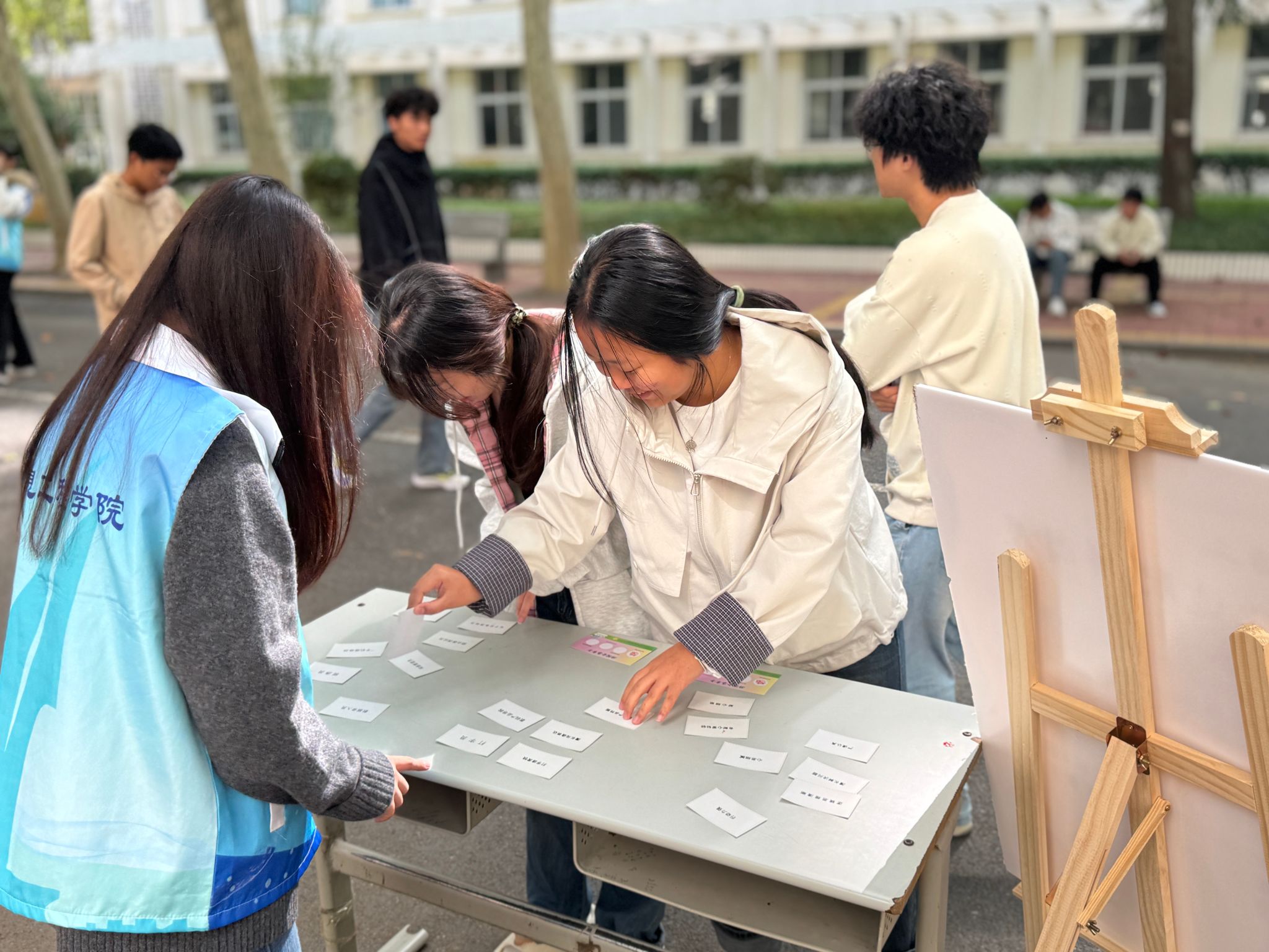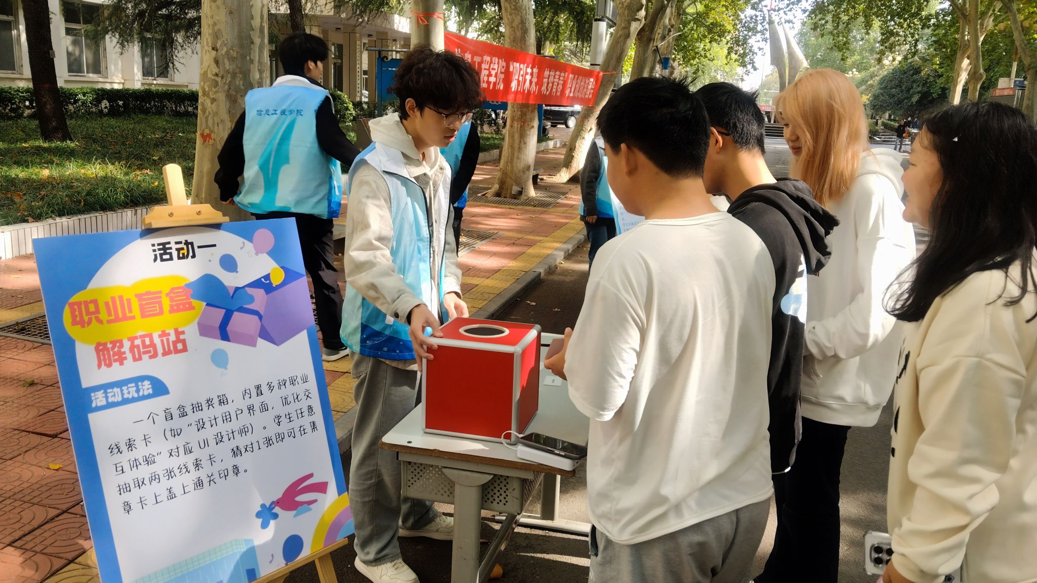 宣传月期间,学院围绕“职引未来,筑梦青春”主题,于10月17日至21日,在天使大道开启职业规划游园会,以趣味闯关形式让学生在轻松互动中探索自我、认知职业。活动开始,学生需先到报名处领取“游园会集章卡”,即可参与四大互动环节,学生从猜测职业核心职责、匹配自身特质与职业需求,到提升职场应对能力、明确职业目标,在轻松氛围中深化职业认知,活动累计吸引200余名学生参与,现场互动热情高涨。
