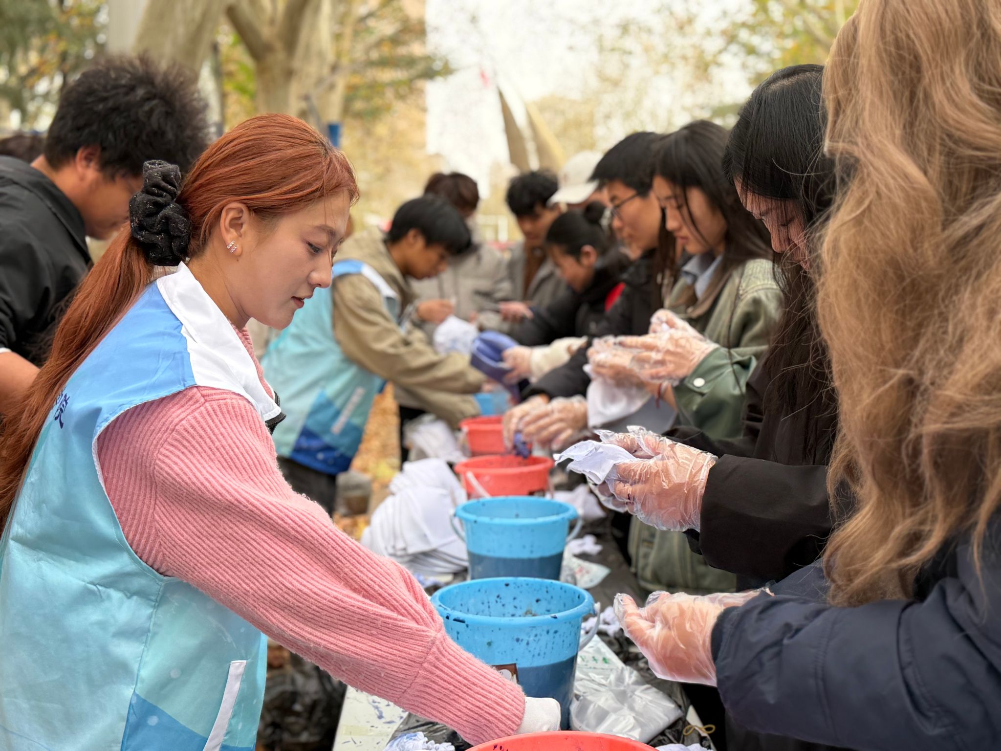扎染活动区内,非遗魅力尽显。师生们自主选取创作材料与工具,借助网上视频教学,快速掌握基础技法。大家充分发挥创意,有的精心设计纹路,让独特肌理在布料上自然呈现;有的大胆搭配色彩,将现代审美融入传统技艺,每一件扎染作品都独具韵味。创作间隙,师生们互相交流技法心得、分享设计灵感,在靛蓝与白布的交织中,感受中华优秀传统文化的深厚底蕴,增强了文化认同感与自豪感。